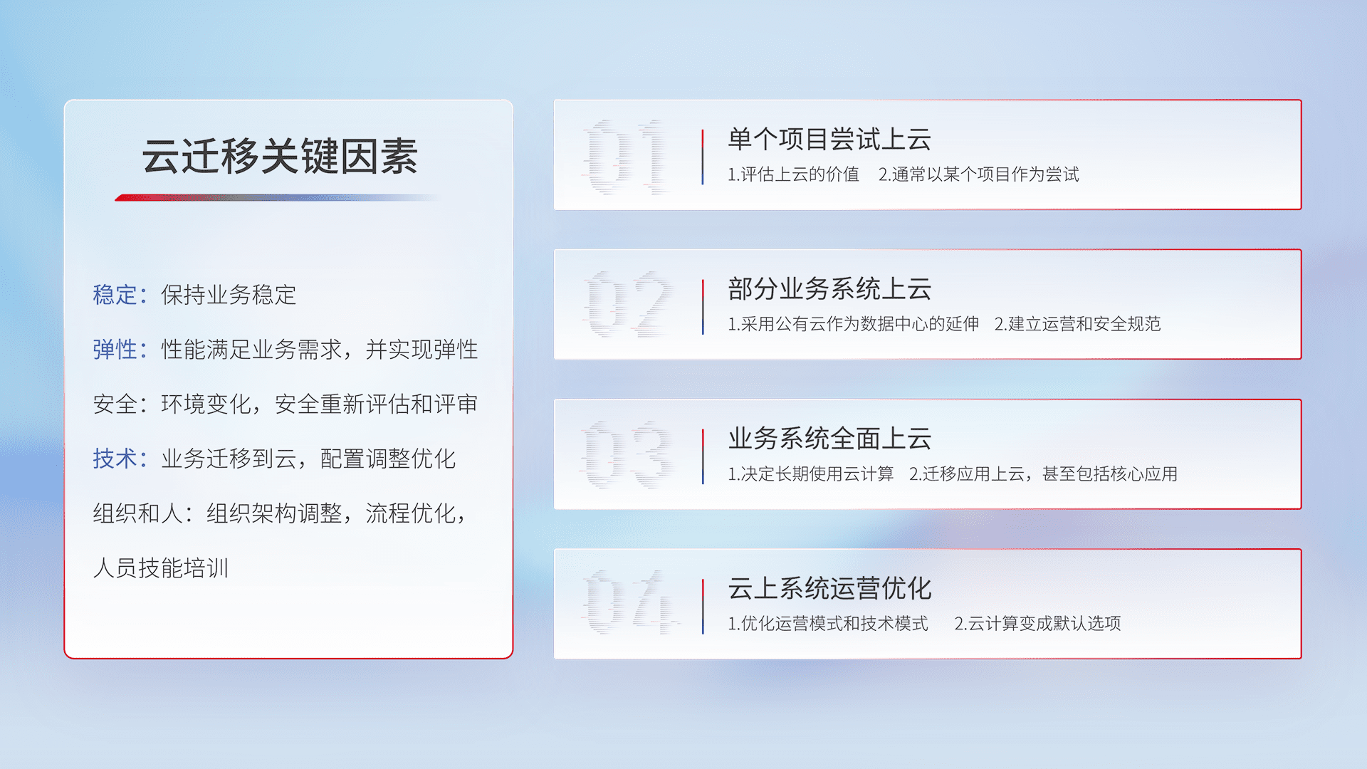 结合实际业务,,从规划设计、、云平台选型、、云原生改造、、、、数据迁移、、、、集成交付,,,迁移全过程为客户识别最佳上云路径,,,做好风险识别管理,,,,设计网络架构、、、身份权限、、、、安全审计合规、、、、操作审计、、、日志审计、、、、监控告警策略、、多站点容灾设计等,,,对云上基础设施进行整体规划,,,,提升IT治理水平,,以满足弹性、、、、高可用、、高性能的需求。。