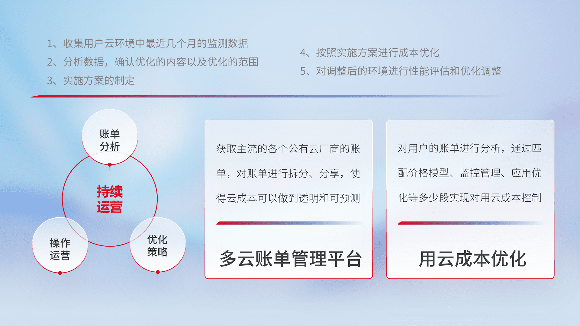 通过多云纳管,,以统一的资源数据模型把客户的云资源进行抽象和封装,,进而实现对多云资源的统一操作,,,,保障云资源管理的可靠性、、、、稳定性与可用性。。。量身定制化运维内容,,配置、、、、开发运维、、、补丁管理、、备份、、、、监控、、认证和访问管理、、、、审计和日常巡检等,,,,保障在用云过程中的可靠度,,稳定度以及高可用率。。